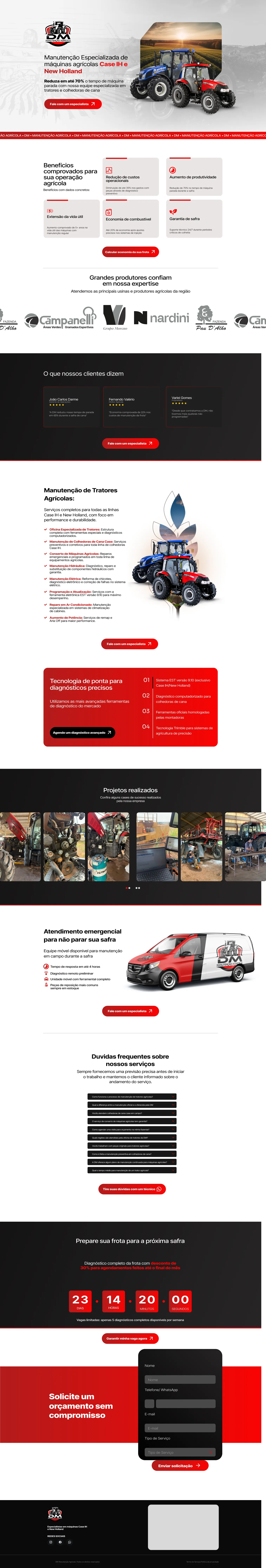 Landing page desenvolvida para a DM Manutenção, empresa de serviços automotivos focada em manutenção preventiva e corretiva de veículos leves e pesados. A estrutura apresenta os principais serviços (troca de óleo, freios, suspensão, elétrica), diferenciais como rapidez, profissionais experientes e atendimento 24h para frotistas, além de depoimentos e formulário para agendamento ou orçamento.