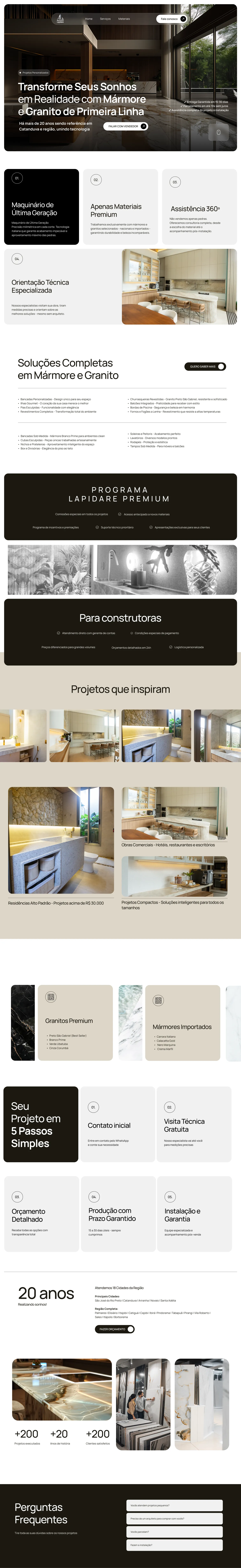 Landing page desenvolvida para a Lapidare Arquitetura, escritório dedicado a projetos personalizados de arquitetura residencial e comercial. A página apresenta serviços como projetos executivos, reformas, interiores e acompanhamento de obras, com galeria de portfólio destacando realizações elegantes e funcionais, além de depoimentos e contato direto para consultoria.