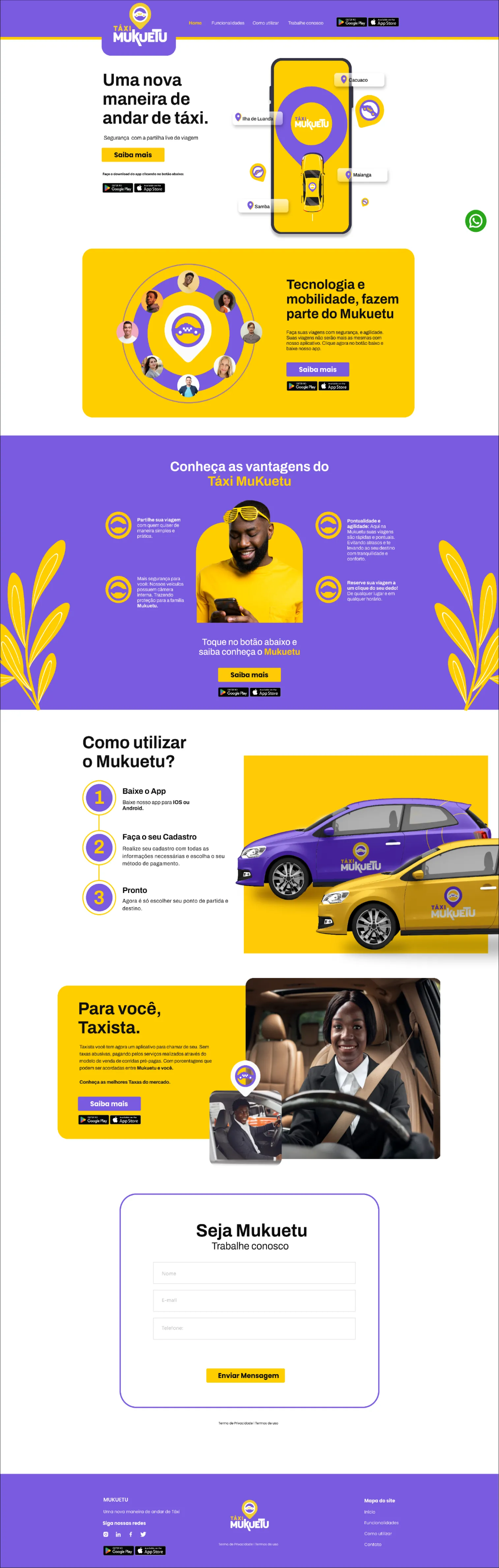 Landing page desenvolvida para o aplicativo Táxi Mukuetu, promovendo uma nova experiência de mobilidade com segurança e praticidade. A estrutura guia o usuário desde a apresentação do conceito, passando por vantagens para passageiros (compartilhamento, segurança, pontualidade, agendamento) e motoristas, até CTAs para download e formulário "Trabalhe conosco".